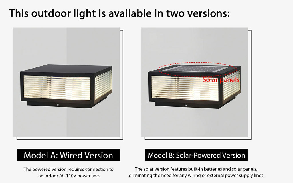 電圧: AC 110-240V (有線バージョン) / DC 3.2V (太陽光発電バージョン).